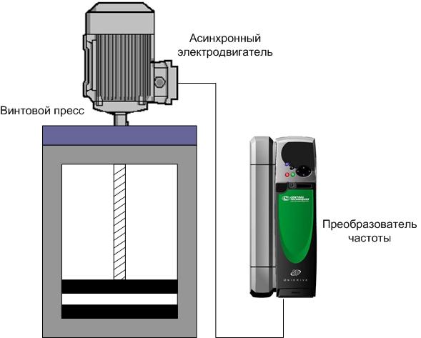 Преобразователь частоты позволяет плавно разгонять и останавливать маховик пресса по заданному закону, так же появляется возможность отказаться от тормоза, используемого для остановки подвижных частей пресса в конце хода вверх. Торможение при этом осуществляется двигателем. Благодаря снижению пусковых токов устраняется напряженный тепловой режим работы электродвигателя, что позволяет избавиться от дополнительного вентилятора охлаждения.